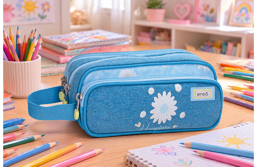 ENSO HAPPINESS prazna pernica sa 3 pregrade savršen je izbor za devojčice koje vole uredno složen školski pribor i nežan, elegantan dizajn. Inspirisana vedrinom plavog neba i lepotom bele rade, ova pernica unosi radost i harmoniju u svaki školski dan. Idealan je dodatak uz rančeve i ostale artikle iz ENSO HAPPINESS kolekcije. Denim tekstura, cvetni motivi i prepoznatljiv Happiness detalj daju ovoj pernici poseban izgled koji se izdvaja među školskim aksesoarima.